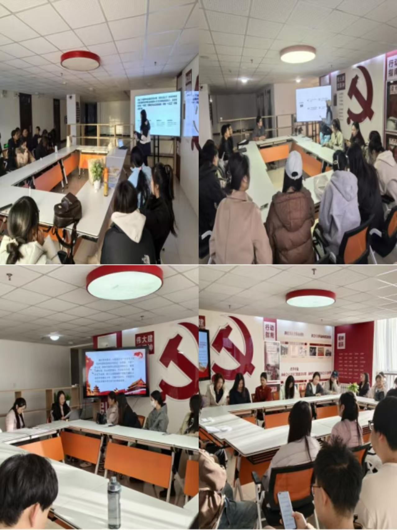 本次培训的交流研讨环节围绕“党的二十届四中全会精神”“党的光辉历史”和“新时代青年的使命与担当”三个主题开展,培训班分小组开展讨论。实践调研环节各组学员从老员工思想政治教育、校园管理优化、学习生活提升等实际问题入手,开展了深入的调研和分析。之后,各小组从选题介绍、团队协作与分工情况、项目开展情况、收获、存在不足及反思等进行展示交流。
