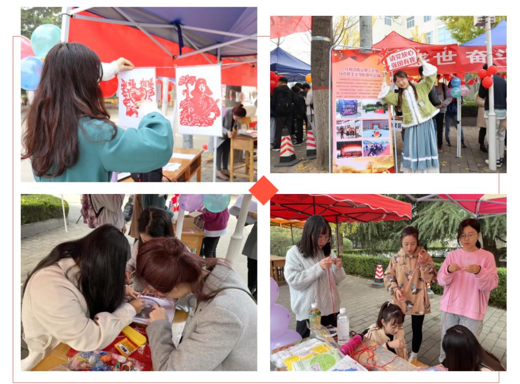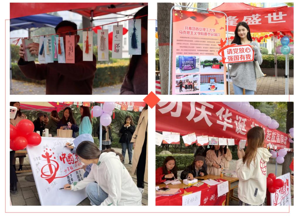 随后,304永利集团研2037班团支部、研2143班团支部与304永利集团基层党建服务队在304永利集团官网曲江校区主干道开展了一系列丰富多彩的活动。一是以"灯谜”为载体,制作了精美的猜谜书签,通过猜谜游戏融入党史知识教育元素,不仅提高了学习党史的趣味性,也使同学们在娱乐的同时能够学习和掌握党史知识。二是以“剪”为笔,书写对党的忠诚和热爱。在剪与刻中,同学们重新感悟党的过往,体会中华儿女骨子里的勤劳能干。三是以“中国结“为载体,来展现中华文明的智慧与情致。同学们在动手编织的过程中,将巧思与文化相结合,增强了同学们对优秀传统文化的认同感和自豪感。最后,同学们纷纷在明信片上写下了对党和国家的美好寄语,并且向一年后的自己邮寄一张盖有“强国有我”专属印章的明信片,用来表示对未来的美好期许和将永远听党话、感党恩、跟党走的坚定信念。
