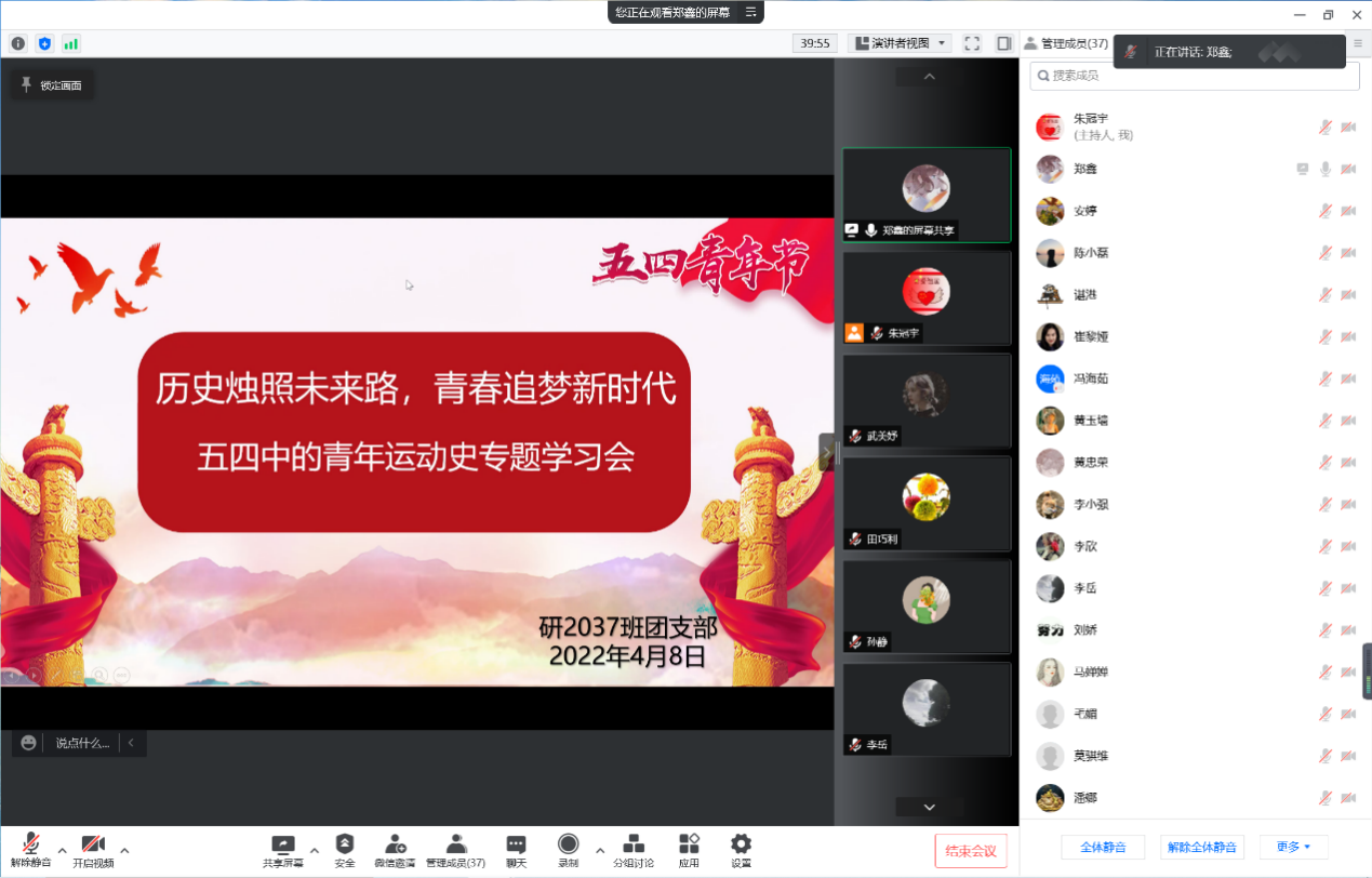 青年是国家的希望,民族的未来。4月8日,304永利集团研2037班团支部线上开展“历史烛照未来路,青春追梦新时代-五四中的青年运动史”主题学习会,支部全体成员参加本次会议。