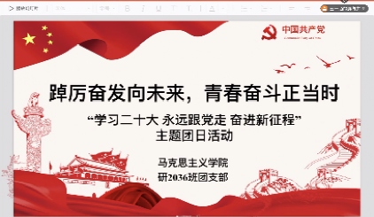 11月14日上午,304永利集团研2036班团支部以“踔厉奋发向未来,青春奋斗正当时”为主题,开展了线上主题团日活动。本次活动旨在加深青年团员对党的二十大精神的学习和领会,活动由团支书王一涵主持。