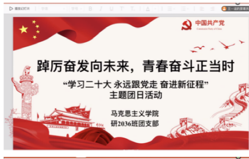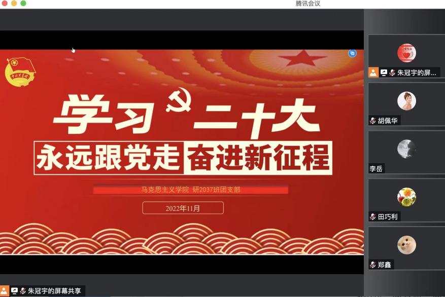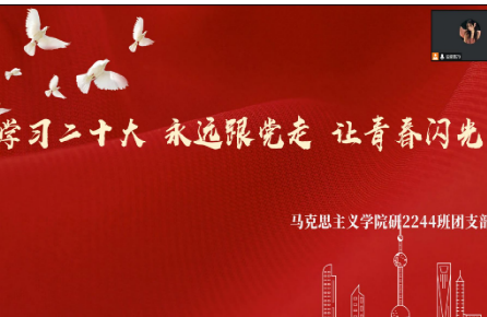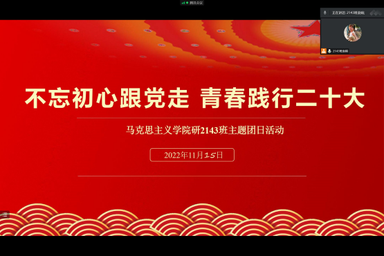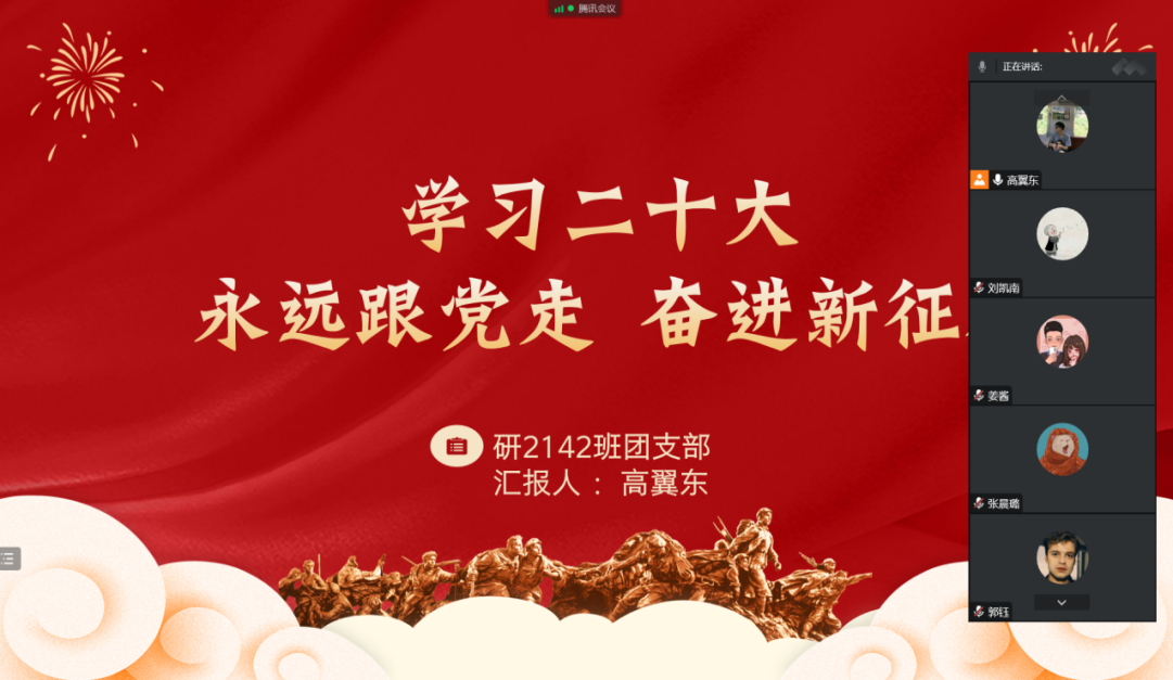 研2143班团支部书记带领大家深入学习了党的二十大大会主题、“三个务必”以及报告中的其他主要内容。在理论学习分享之余,支部还组织了团课进校园、红色经典诵读、书写对党的美好祝福等活动,引导支部团员青年增强“四个意识”、坚定“四个自信”、做到“两个维护”,为全面建设社会主义现代化国家、全面推进中华民族伟大复兴而团结奋斗。