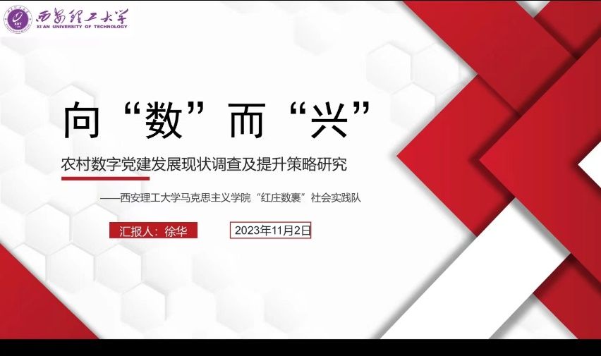 随后,公司今年组队的8支团队代表张书梦、封紫阳等同学分别以《以红色遗产遗迹为依托传承红色精神-以陕西省铜川市、蓝田县等地为例》《新时代我国家教家风现状时政调查-以陕西省铜川市为例》《陕西长征文物保护与利用》《红色文化赋能乡村文旅智慧发展》《书香润童心-将农家书屋打造成儿童的“精神乐园”》《向“数”而“兴”:农村数字党建发展现状调查及提升策略研究》《基层治理现代化视角下社区党建治理模式与经验研究-基于雁塔区漳浒寨街道办社区研究》等为题,从选题立意、实践过程和报告撰写、心得体会等四个方面进行了详细的介绍。
