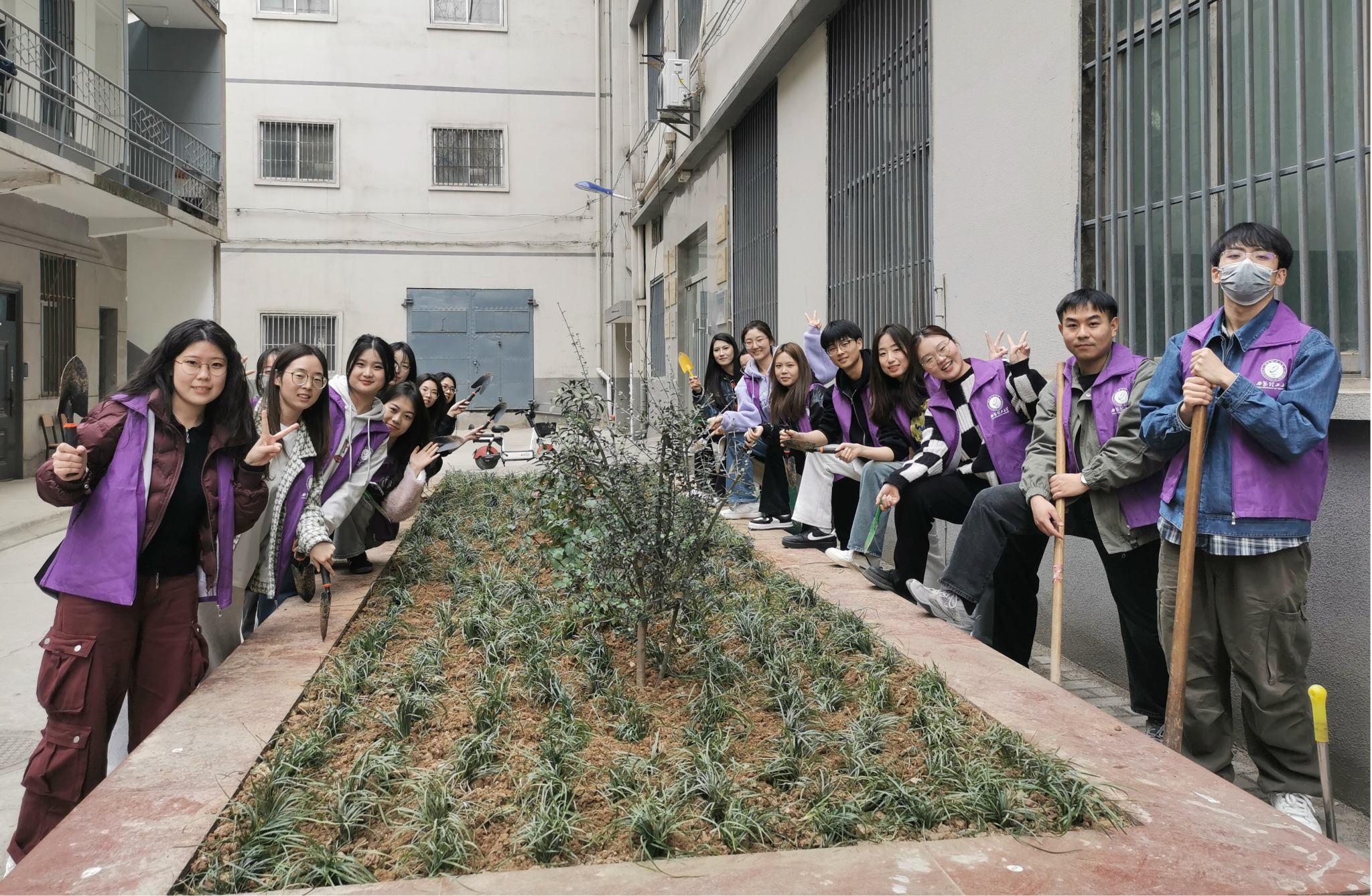 种完月季花,孙老师带领同学们来到另一个花坛种植麦冬草。孙老师向同学们详细介绍了麦冬草这一兼具观赏价值和药用价值的植物特点,它耐得住恶劣环境、适应能力很强,在保持水土、涵养水源方面发挥了重要的作用。有了之前种植月季的经验后,同学们挖坑、浇水更加得心应手,分区域完成种植任务,大家表示,未来要学习麦冬草无私奉献的品格,将雷锋精神代代相传。
