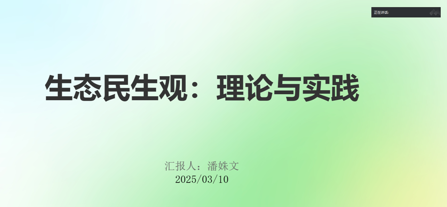 烟台大学2024级马克思主义中国化研究专业硕士研究生潘姝文以“生态民生观:理论与实践”为主题,围绕生态民生观的核心理念、伦理重构与公平正义、发展的价值标准与实践、研究方法与差异化发展、生态民生观的全球意义五个方面进行了详细讲解,认为生态民生观将生态保护与民生改善紧密结合,打破了传统二元对立思维,为全球环境保护与社会发展提供了新方向。
