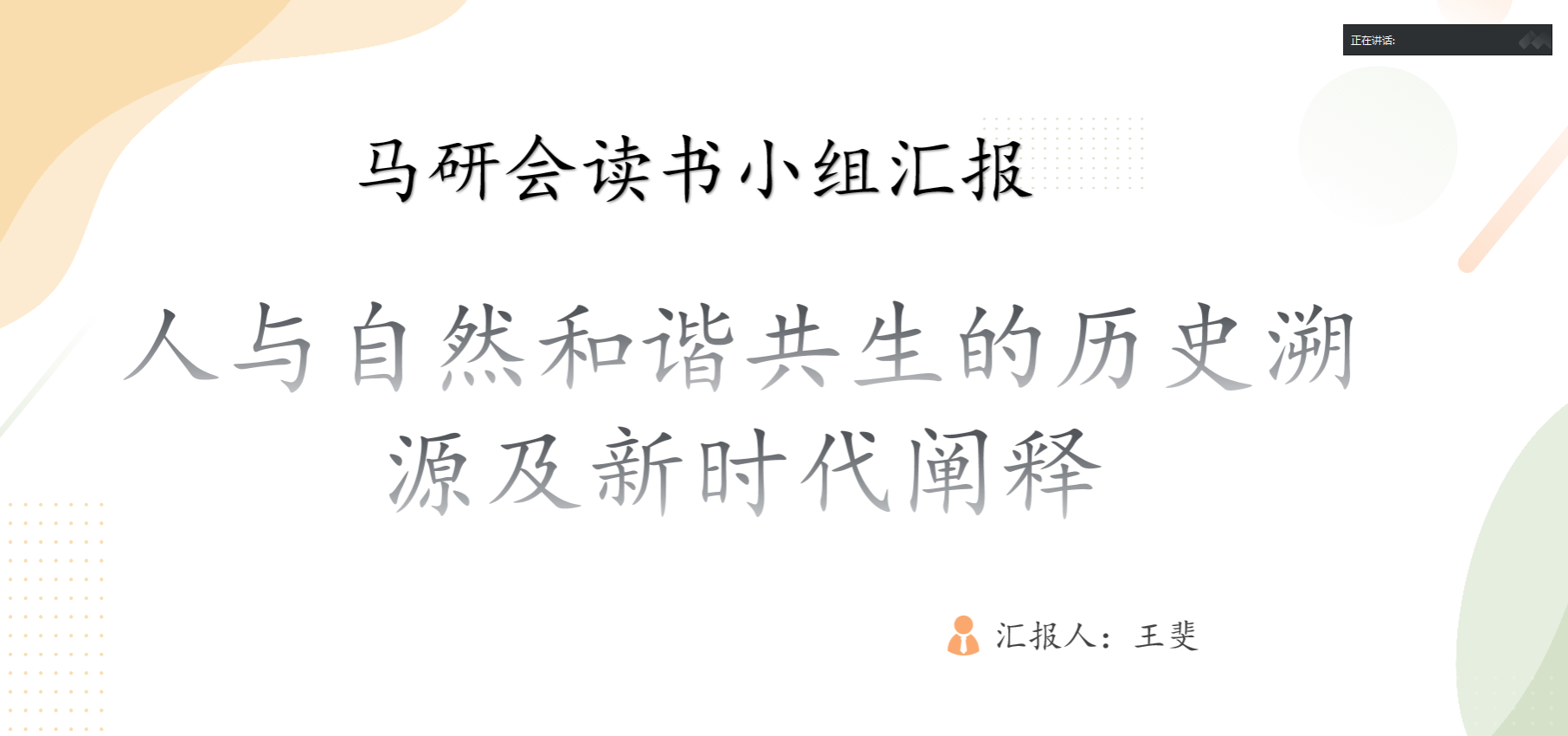 读书会开始,烟台大学《论坚持人与自然和谐共生》读书小组组长马悦骁介绍本期读书活动情况。随后,读书小组成员依次进行分享。