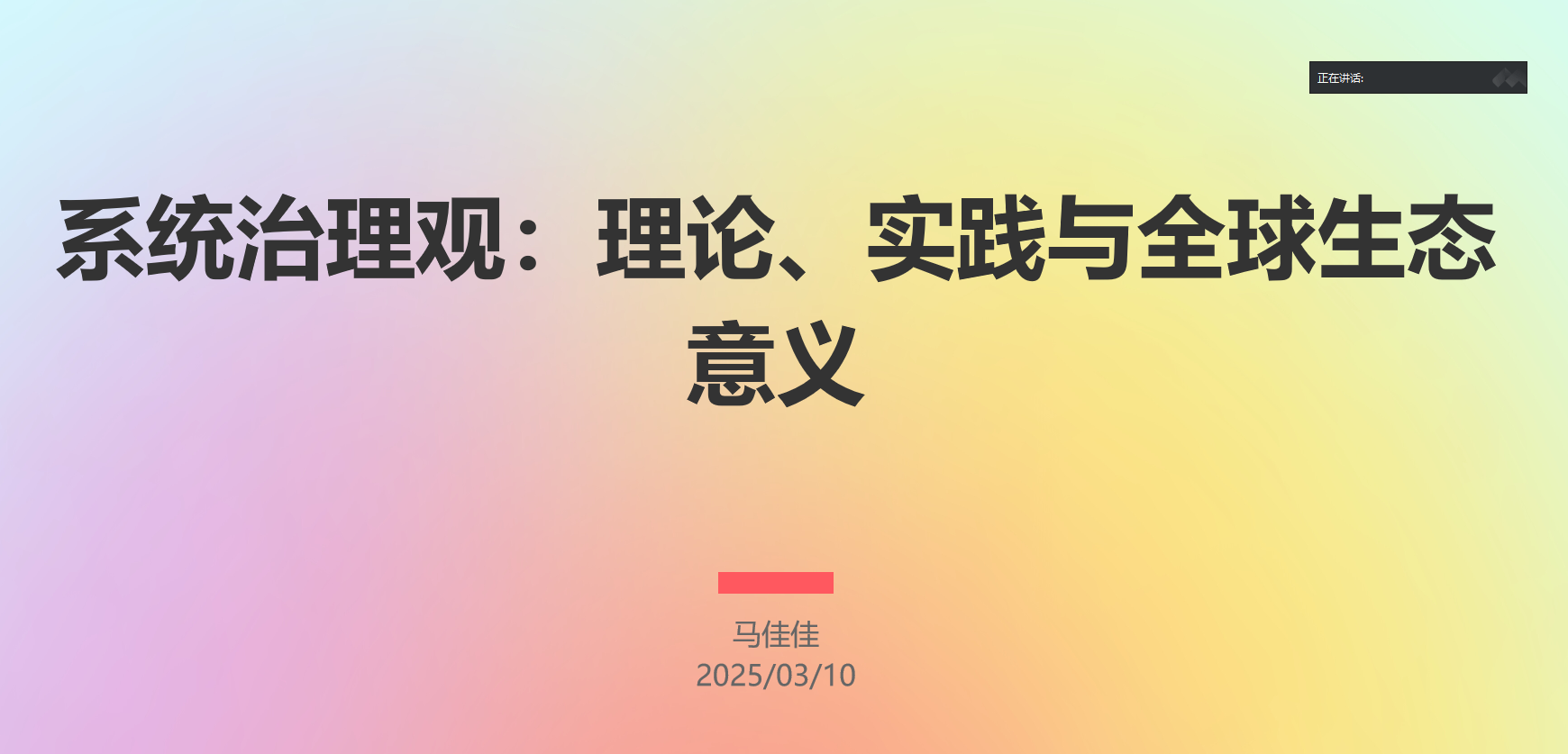 烟台大学2024级马克思主义中国化研究专业硕士研究生马佳佳以“系统治理观:理论、实践与全球生态意义”为主题,从理论基础、实践案例、文明意义、研究方法、结论与展望等方面进行了深入阐释,认为进一步深化系统治理观研究,需要融合生态学、经济学、社会学等多学科知识,促进理论创新与实践深化。