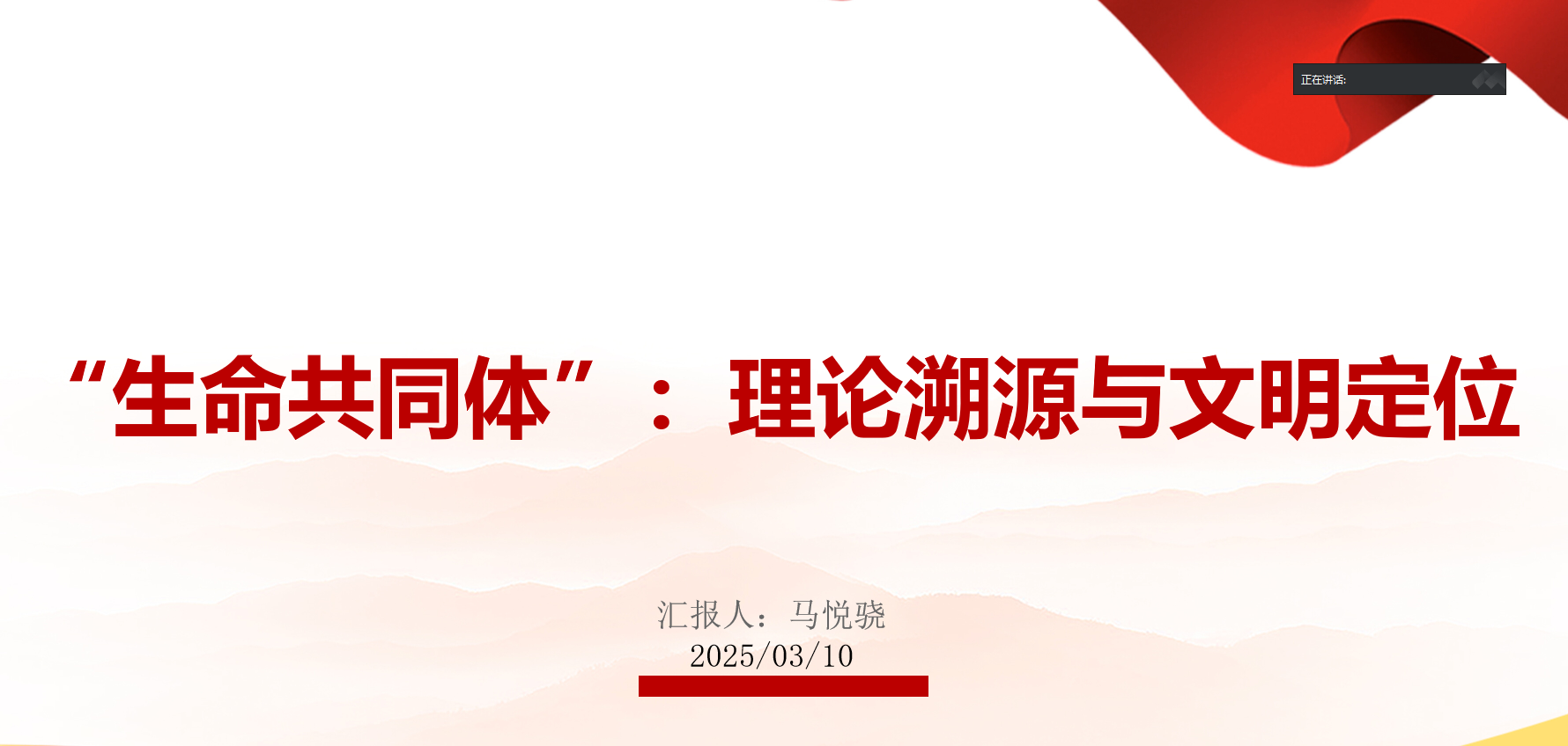 烟台大学2024级马克思主义中国化研究专业硕士研究生马悦骁以“‘生命共同体’:理论溯源与文明定位”为主题,从马克思主义自然观的继承与发展、从单向依赖到共生共荣、工业文明的批判性重构、制度创新与治理效能、生态文明的历史必然性等方面进行了分享,认为生命共同体理念重塑文明与自然的关系,倡导和谐共生,为生态文明提供新的文明契约框架。