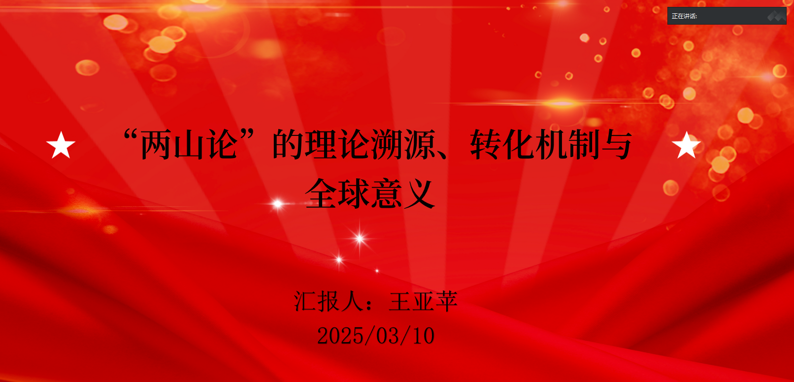 烟台大学2024级马克思主义中国化研究专业硕士研究生王亚苹以“‘两山论’的理论溯源、转化机制与全球意义”为主题,从“两山论”的理论溯源、“两山论”的转化机制、“两山论”对西方生态经济理论的超越进行了分享,认为绿水青山既是自然财富、生态财富,又是社会财富、经济财富。