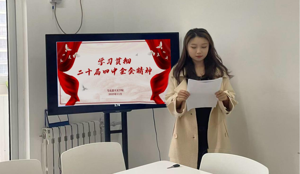 会议伊始,小组成员裴泽宇领学党的二十届四中全会内容,并结合自己感兴趣的生态文明部分谈了学习体会。她谈到,全会提出的“加快经济社会发展全面绿色转型”战略,为青年学子践行绿色生活方式提供了清晰指引。“生态文明建设并非遥远的政策表述,而是渗透在我们生活的方方面面。”她从校园生活看到的点滴变化,如垃圾分类、新能源充电桩的普及,体会到“协同推进降碳、减污、扩绿、增长”是党带领人民破解发展矛盾的生动实践。作为马克思主义专业的员工,她认识到生态理念的传播需要扎根现实,作为未来的思政工作者,应致力于“搭建起理论与实践的桥梁,用群众听得懂的语言、看得见的案例,让生态价值观落地生根”。她承诺将从论文减耗、低碳出行等小事践行生态责任,展现青年担当。