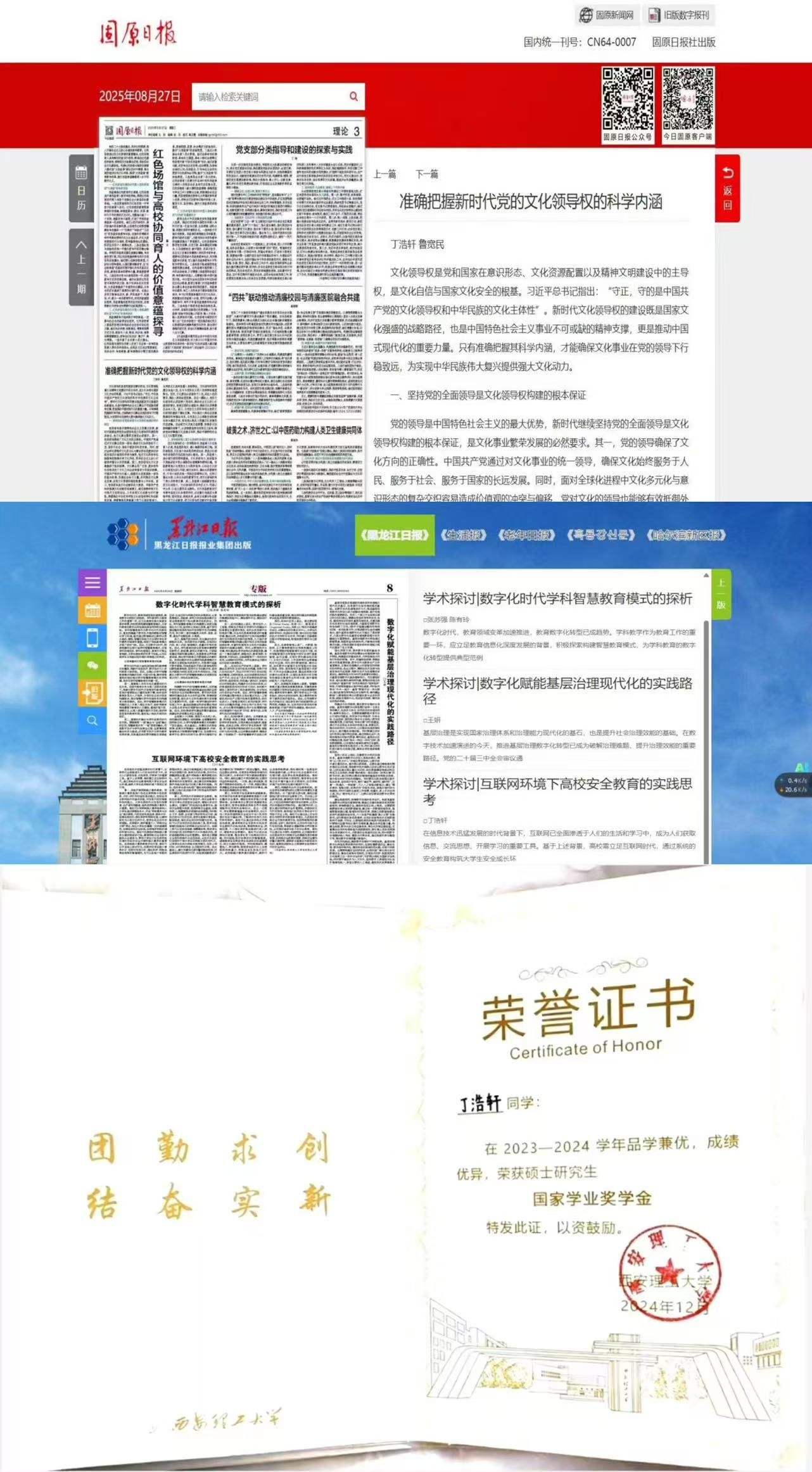 在学术科研的征程上,她始终秉持严谨求实的治学态度与开拓创新的探索精神,将课堂所学与理论研究紧密结合,关注时代课题,聚焦理论前沿,凭借扎实的理论功底和敏锐的问题意识,在省级报纸发表理论文章3篇,在地市级党报发表理论文章2篇。在专业学习上,刻苦勤奋,成绩始终名列前茅,曾获得研究生国家奖学金、国家学业奖学金、公司学业奖学金,夯实了专业根基。
