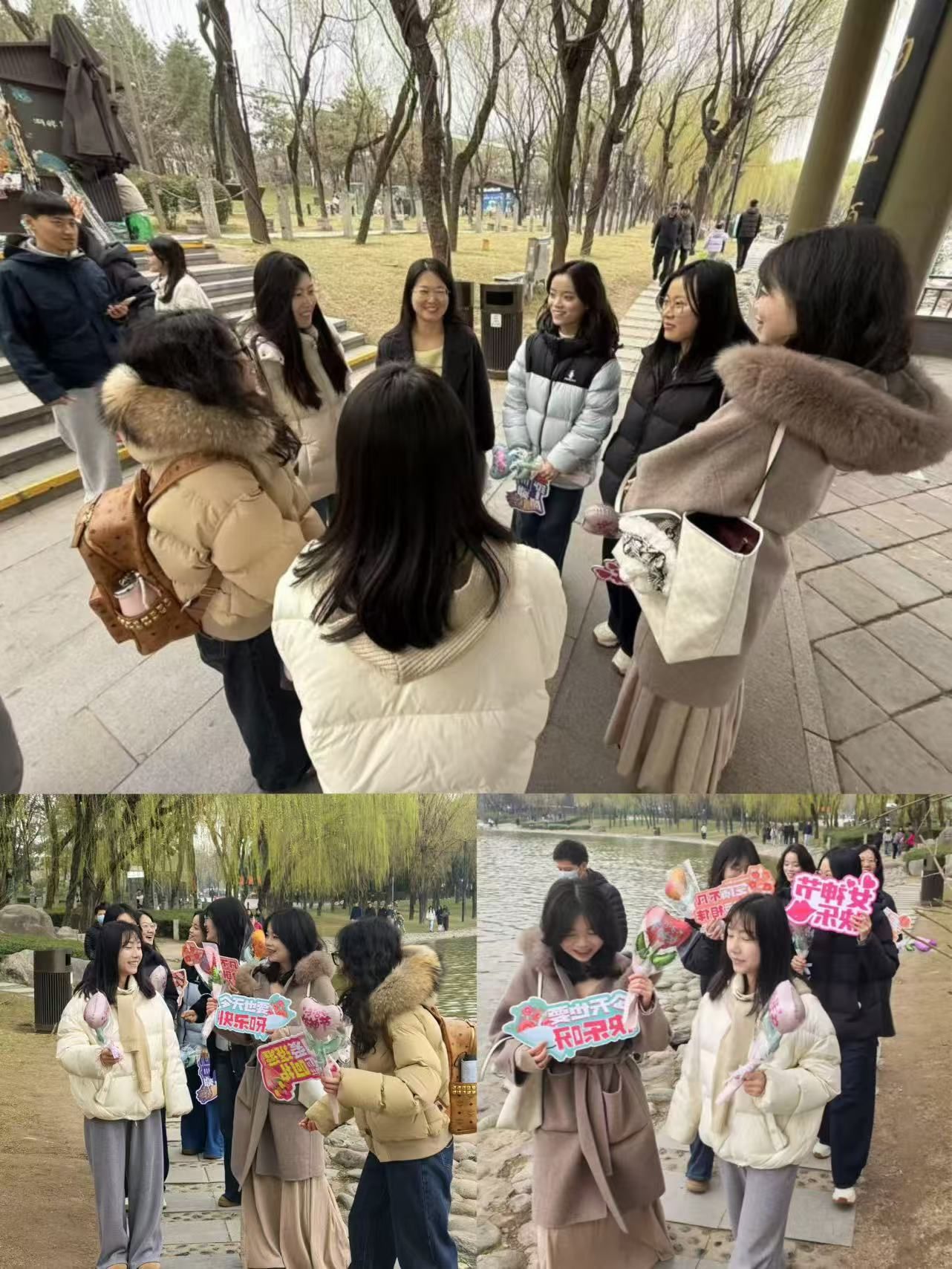 曲江池,自古便是文人墨客流连吟咏之地,唐代诗人白居易曾在此留下“曲江初碧草初青”的佳句。千年之后,这片承载着诗意与历史的水畔,迎来了马院学子的青春身影。活动伊始,同学们在曲江池遗址公园东门集合签到,研究生会为每一位参与者送上精心准备的节日礼物——一束束色彩斑斓的气球小花。气球轻盈、花朵明媚,传递着公司对女性学子诚挚的祝福与温暖的敬意,也为春日午后增添了一抹柔美与亮色。
