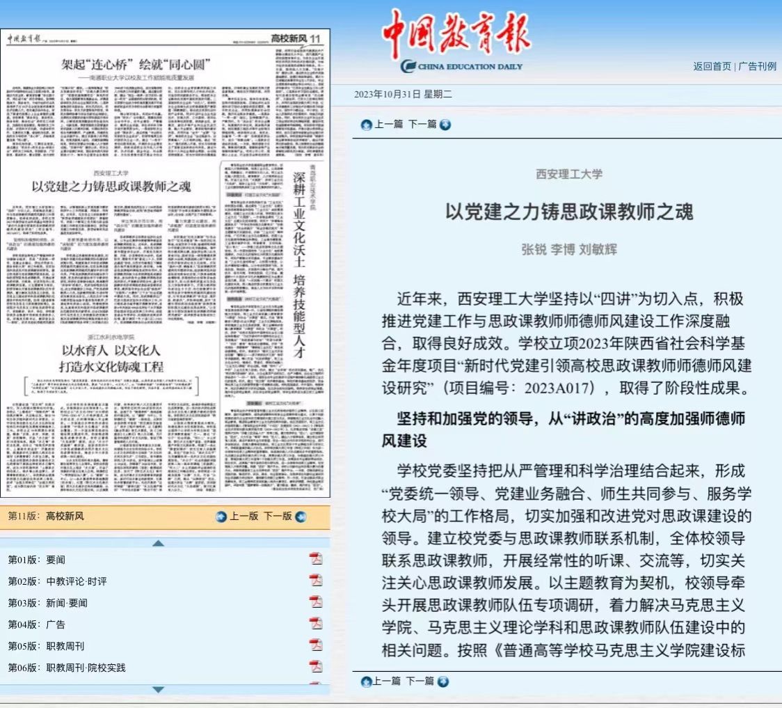近年来,304永利集团官网坚持以“四讲”为切入点,积极推进党建工作与思政课教师师德师风建设工作深度融合,取得良好成效。公司立项2023年陕西省社会科学基金年度项目“新时代党建引领高校思政课教师师德师风建设研究”(项目编号:2023A017),取得了阶段性成果。